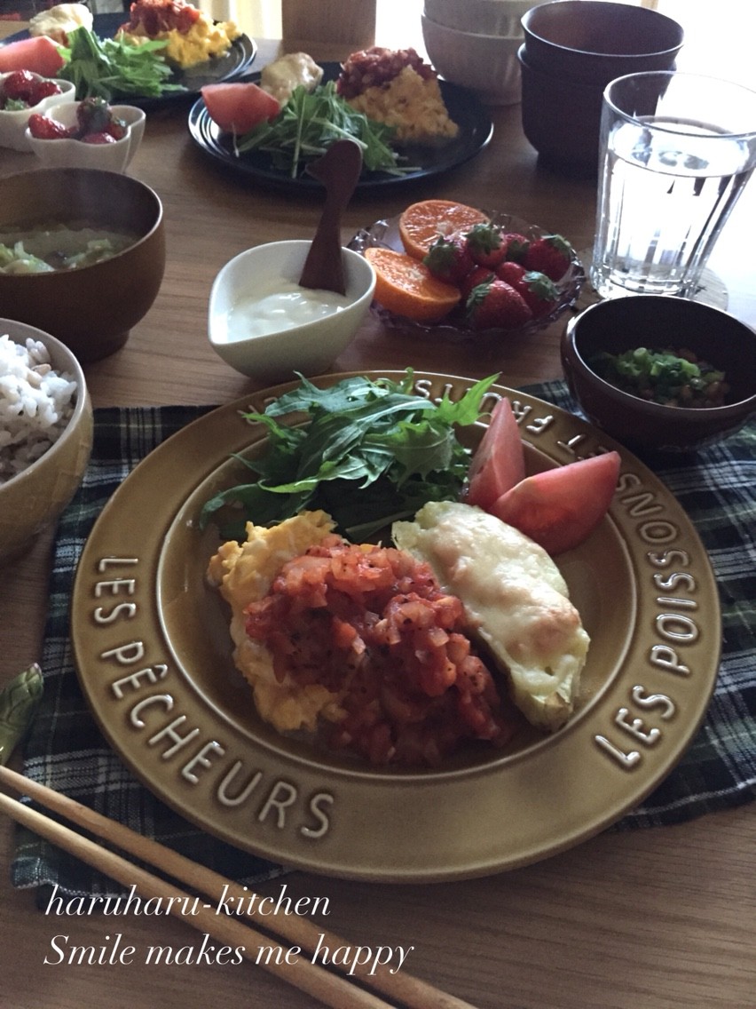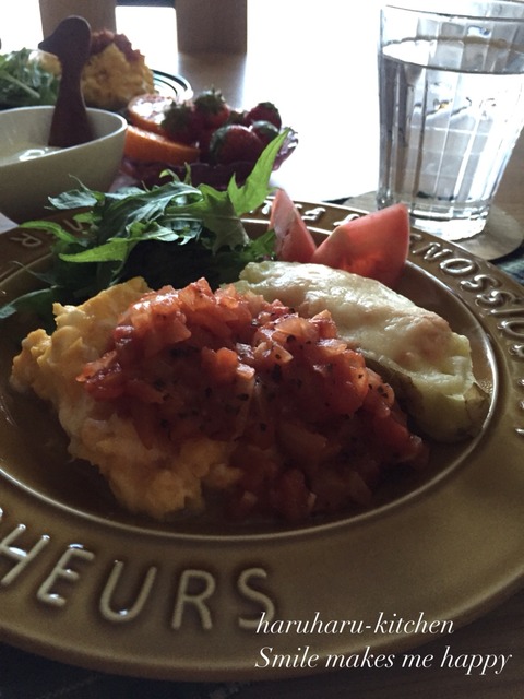 ふわふわのスクランブルエッグに、昨日のバジルトマトソースを添えました!