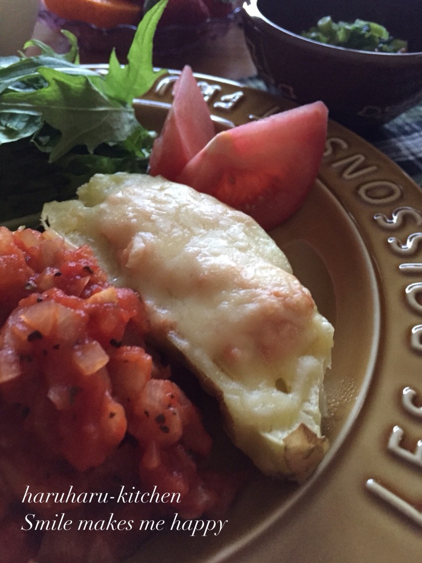 じゃがいもを丸ごとレンチンして、半分にカットしたじゃがいもに、たらマヨぬってチーズのせてトースターで焼いたものを…