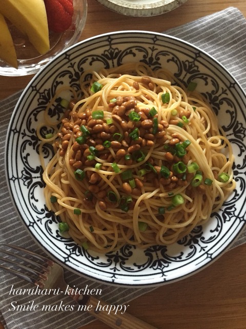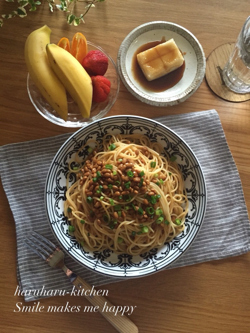 納豆スパゲッティにすると、すぐ食べられるから良いんだってさ!