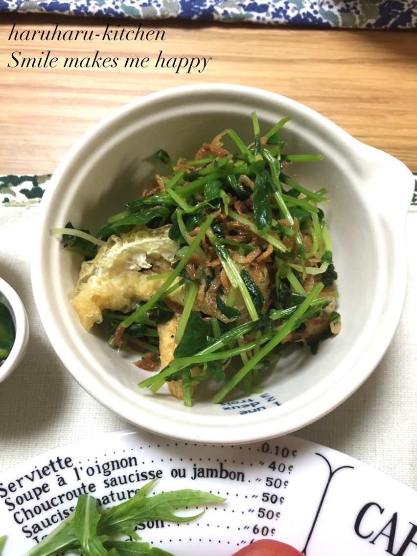 油揚げと干しエビをカリッと焼きあげてから豆苗を炒めたよ