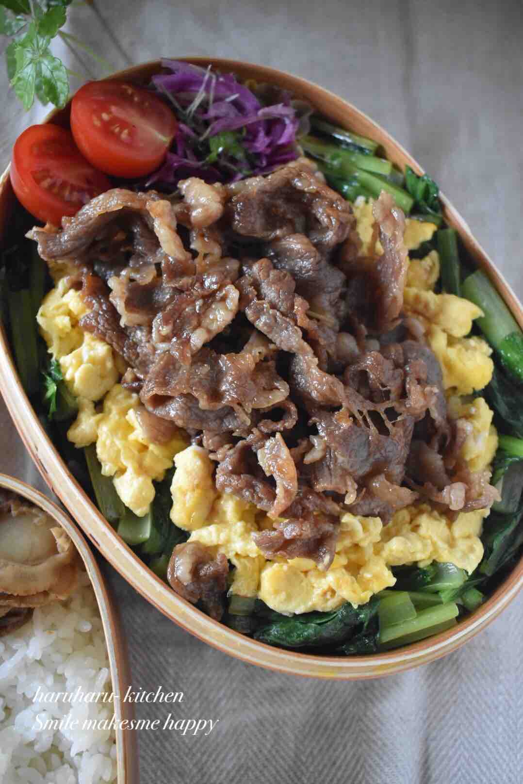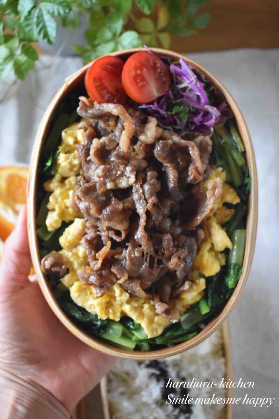 炒めた小松菜、炒り卵、牛肉甘辛煮を盛り付けたら完成!