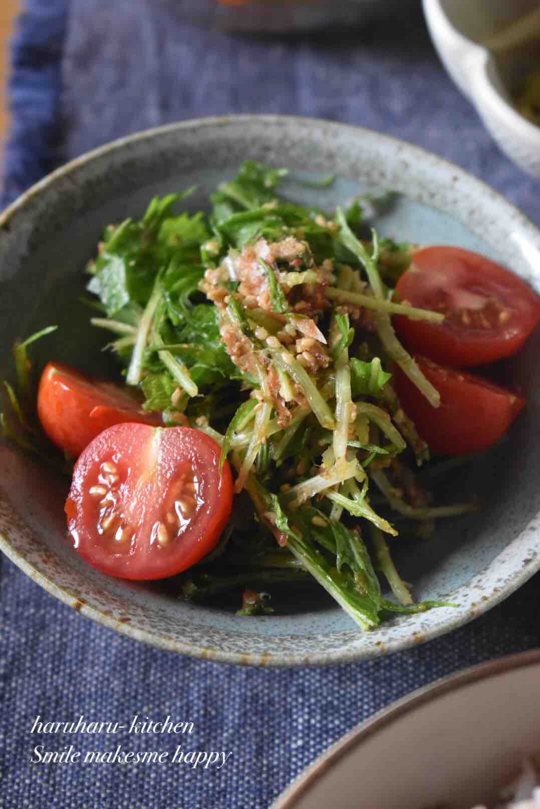 水菜はちぎって、ごまやかつ節と混ぜて、楽ちん副菜!