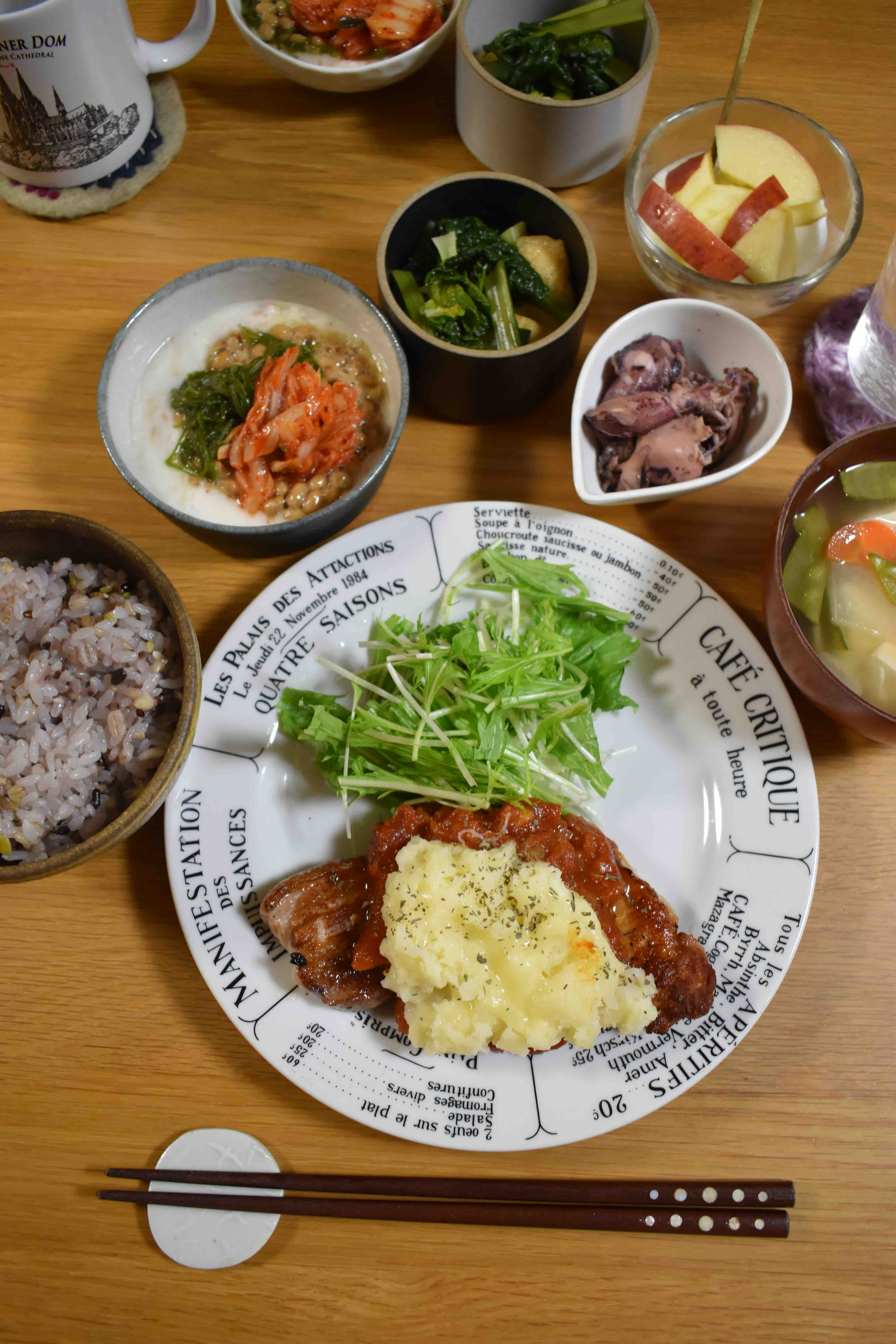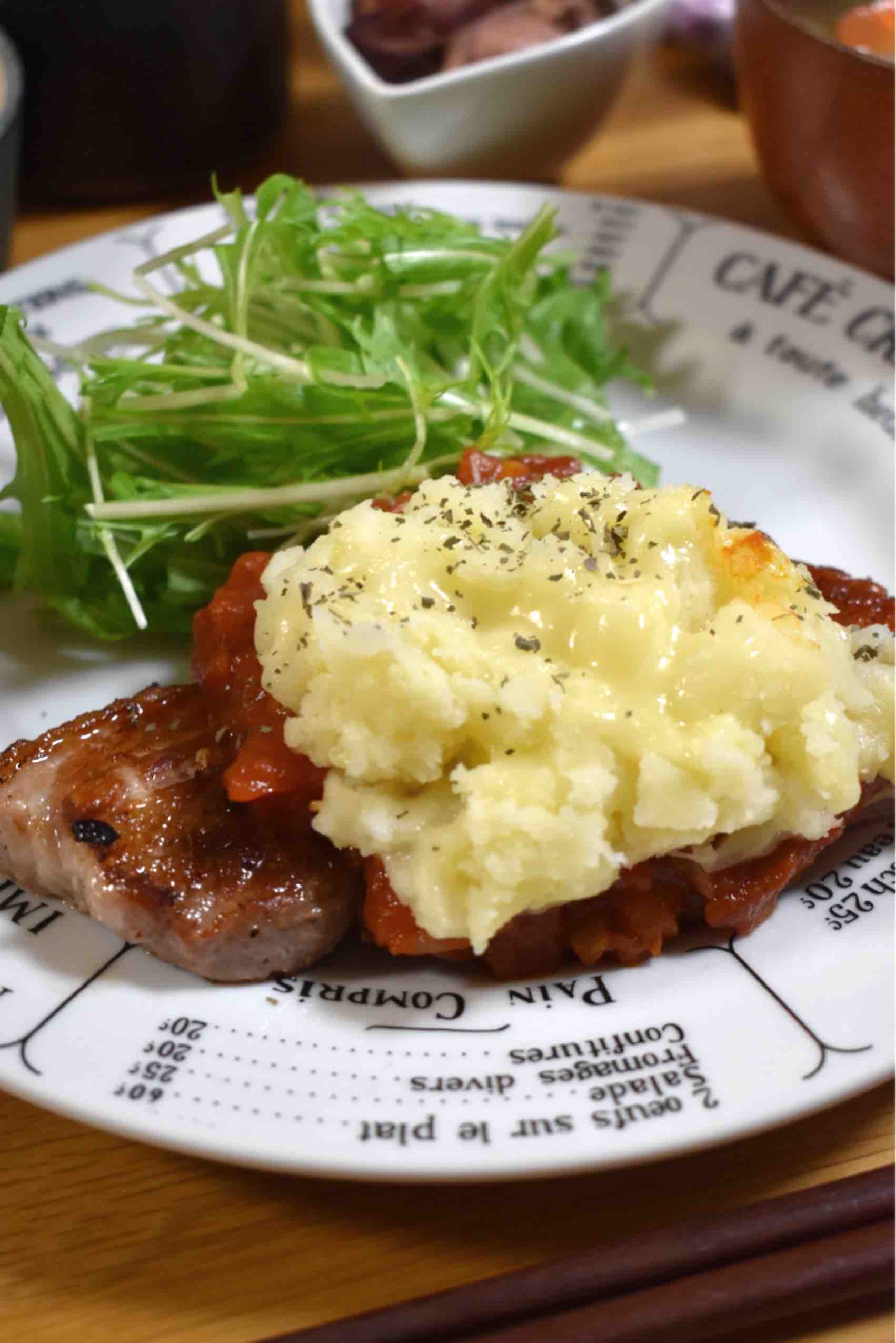 昨日は、ガーリックポークソテーにトマトソース&チーズマッシュポテトをのっけたものです。