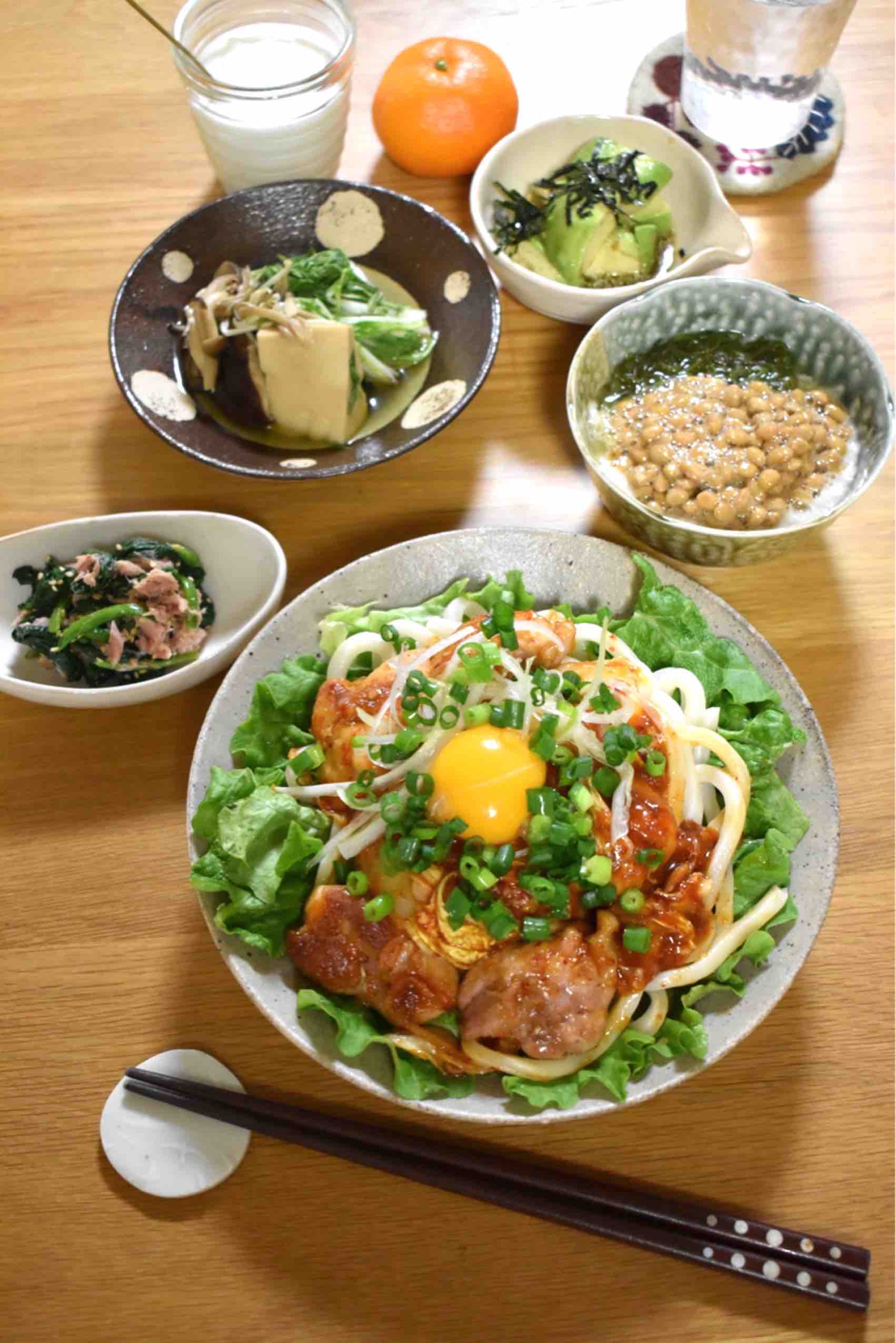 4、器に、レタス、うどん、照り焼きチキンキムチをのせ、残ったタレを回しかける。卵黄、こねぎを散らして完成。
