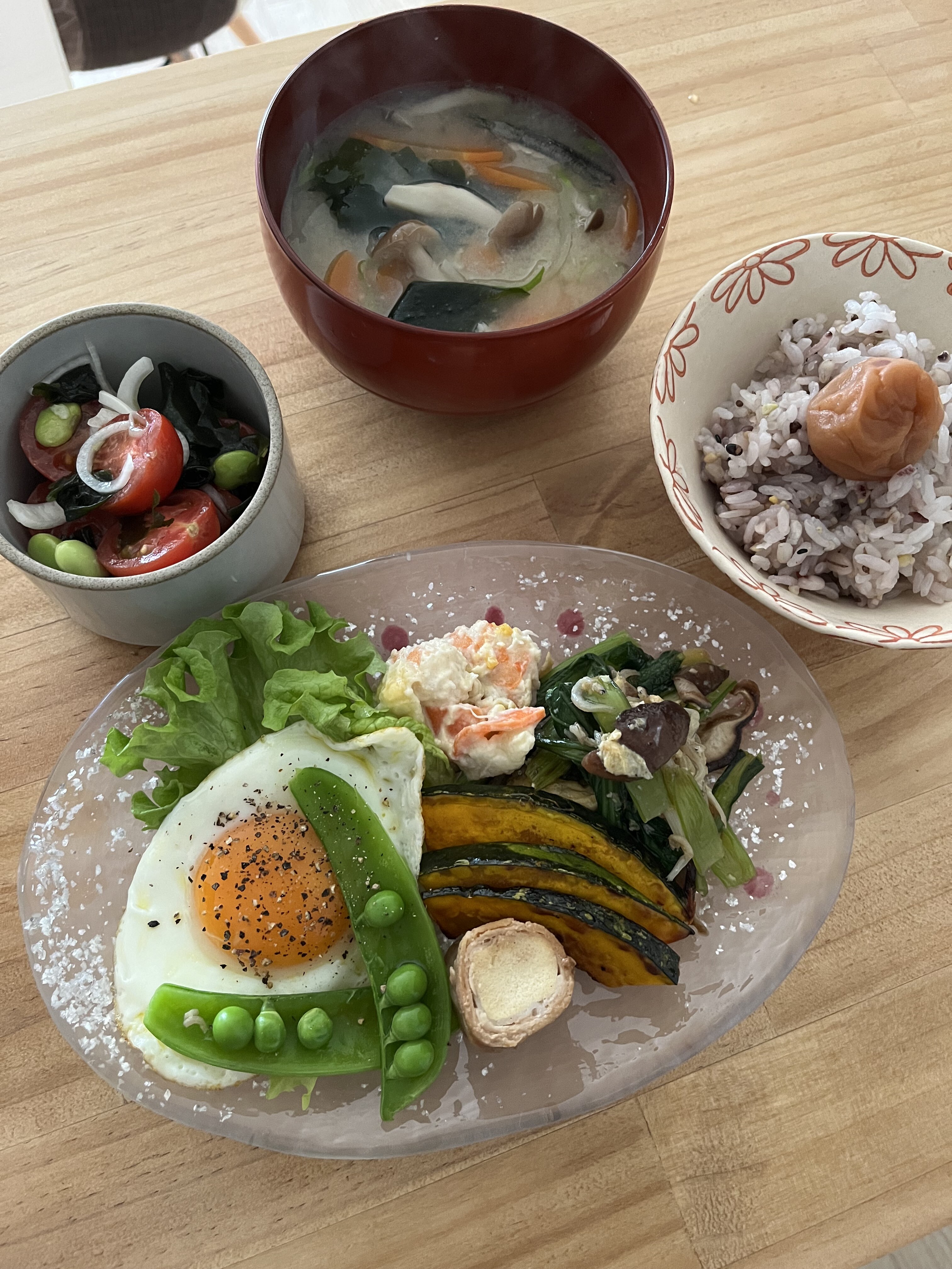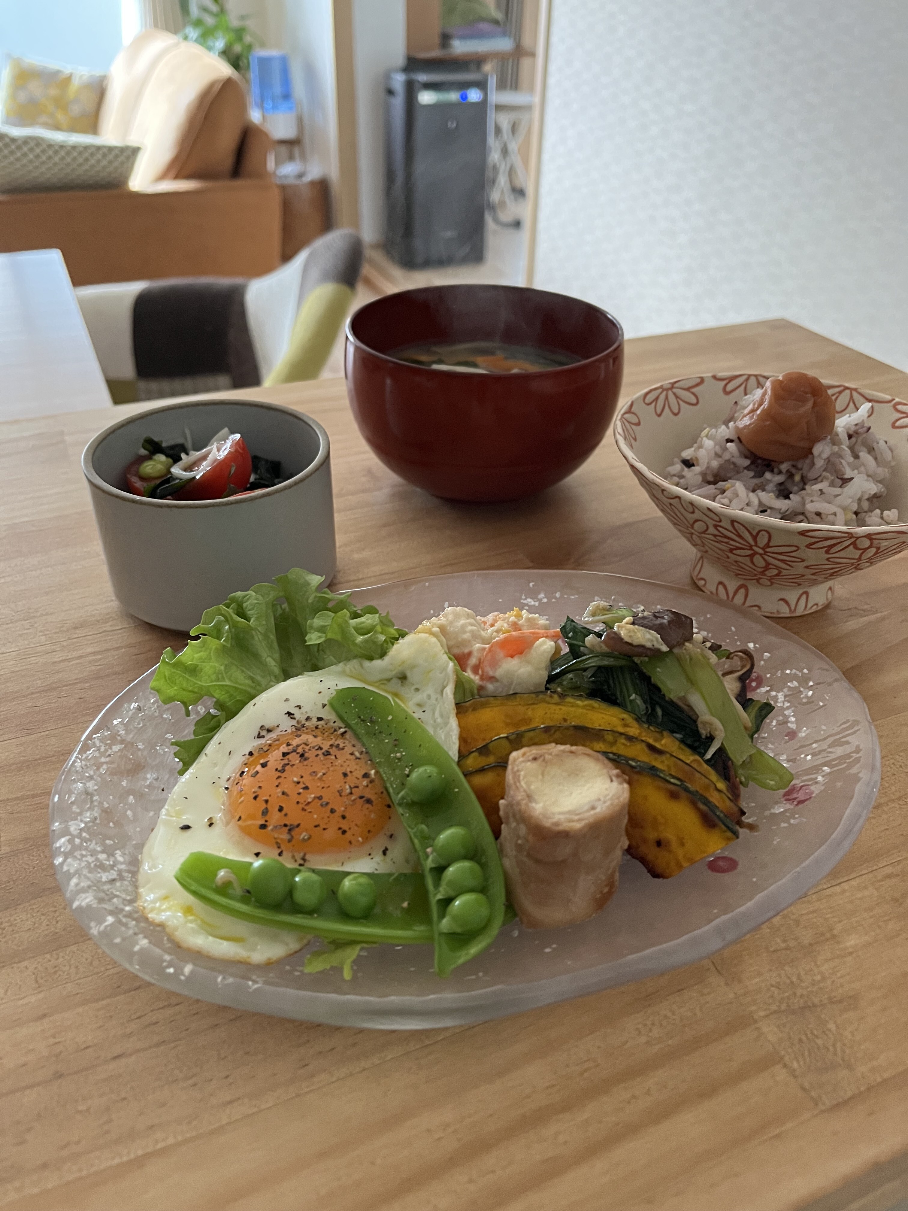 目玉焼きと味噌汁作って
