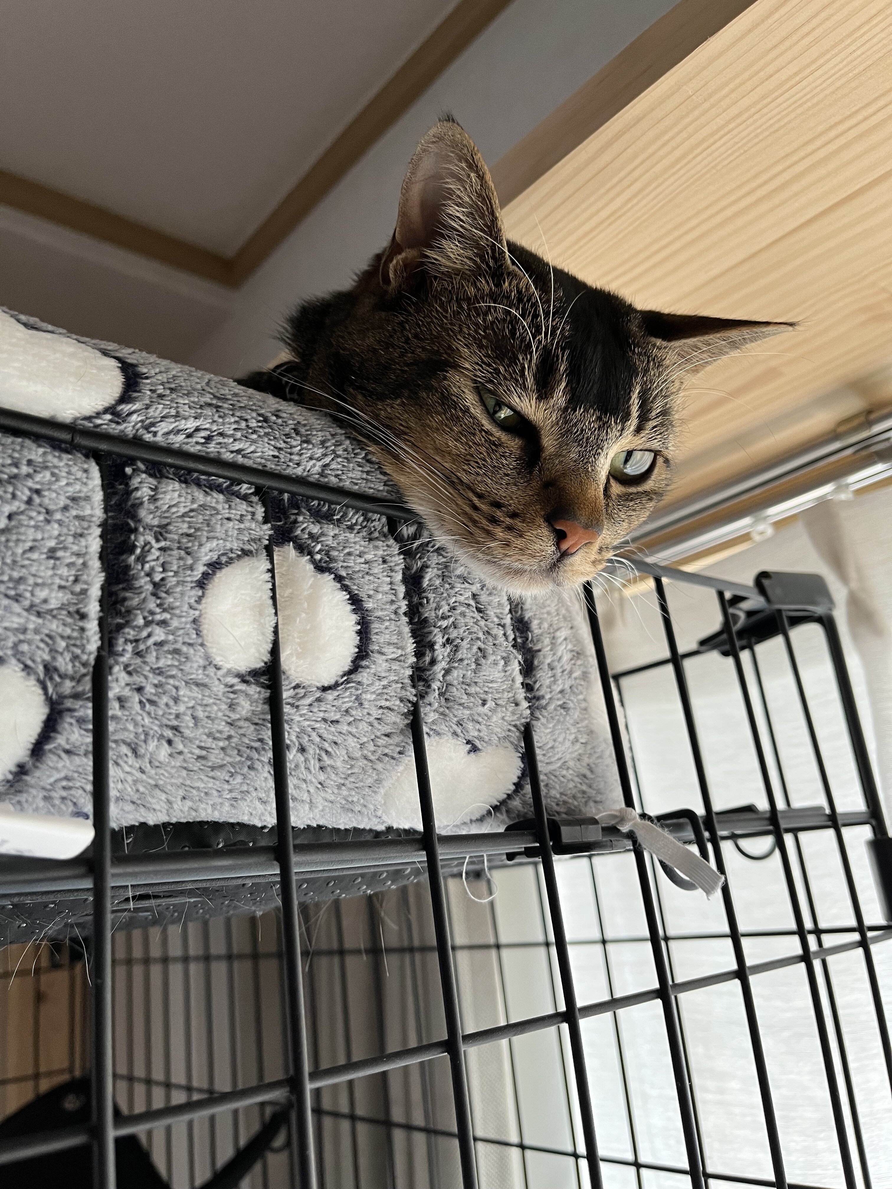 ケージの一番上から見下ろすつむ姫の不細工な顔が何とも愛おしい〜