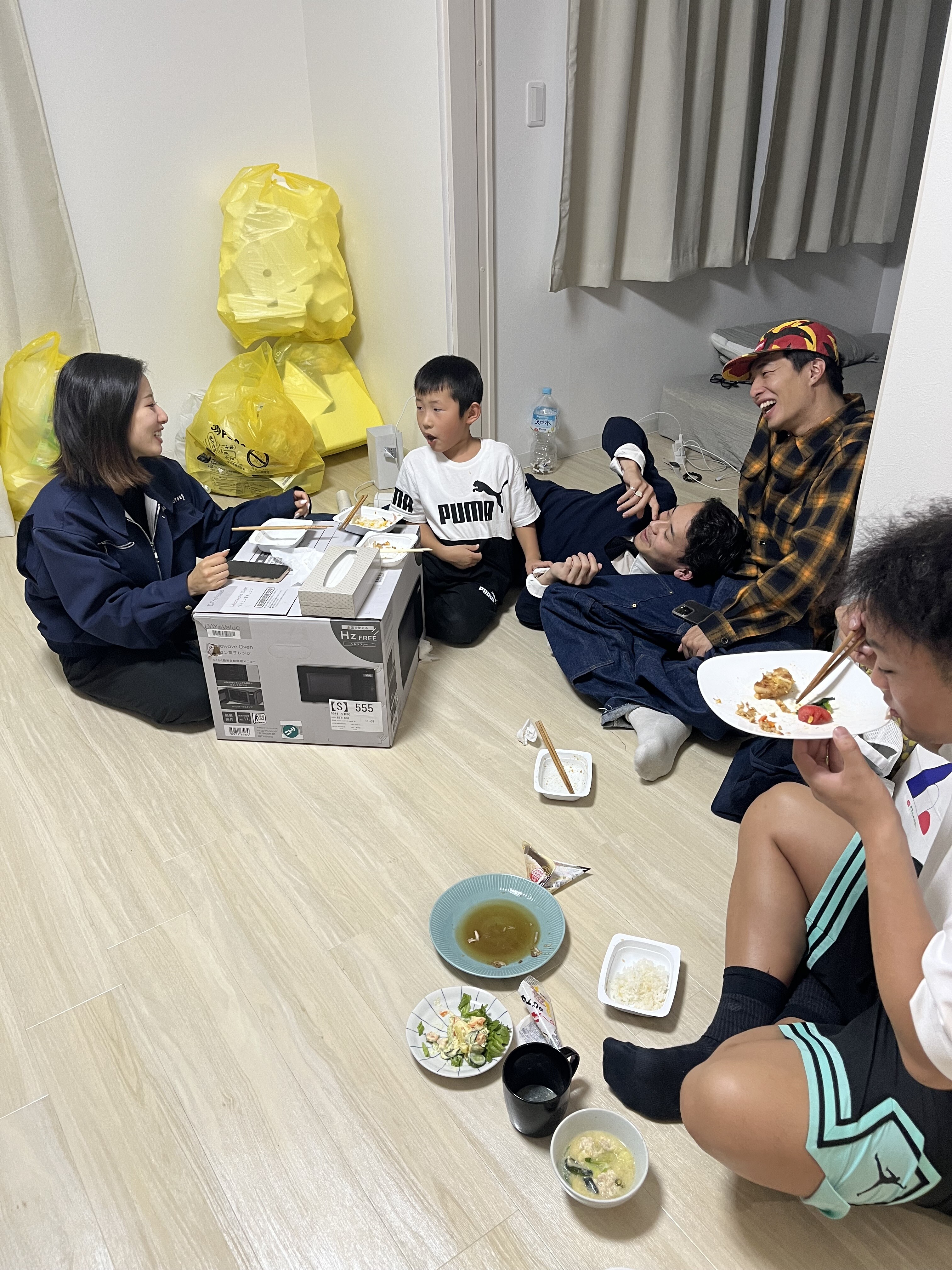 まだ引っ越したばかりだから、テーブルもなくてね、仕方なく段ボールと床に置いて食べたよ。